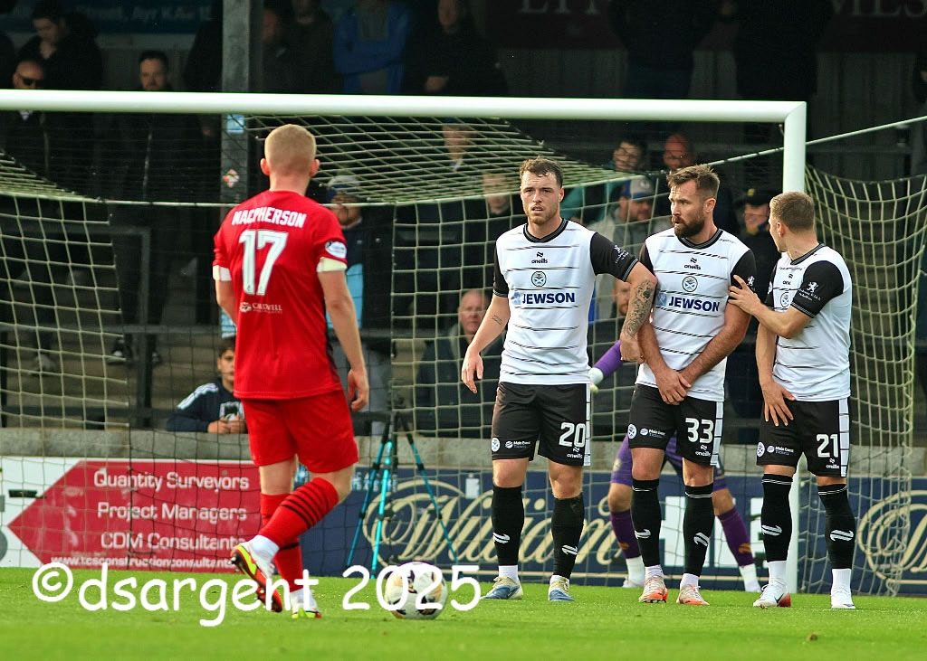 The Ayr defensive wall faces a 'Ton free-kick.