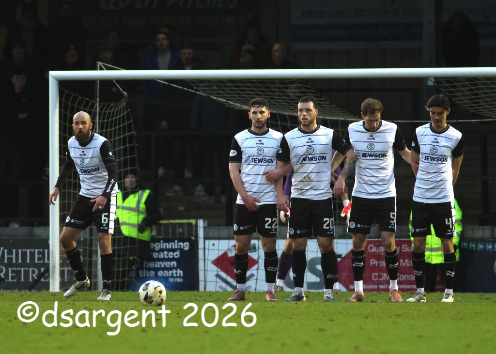 The Ayr wall faces a free-kick late in the game.