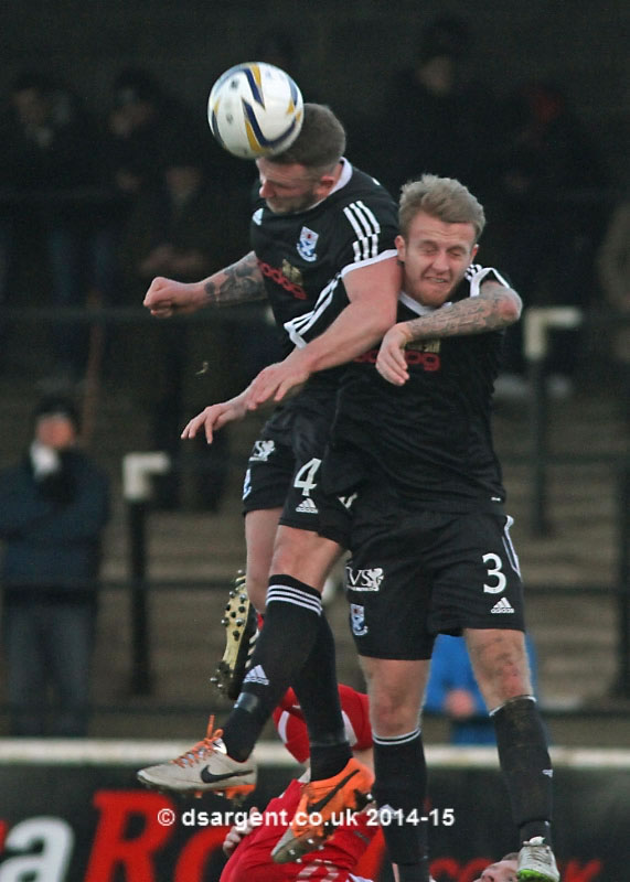 Kevin McKinlay and Robbie Crawford contest the same ball