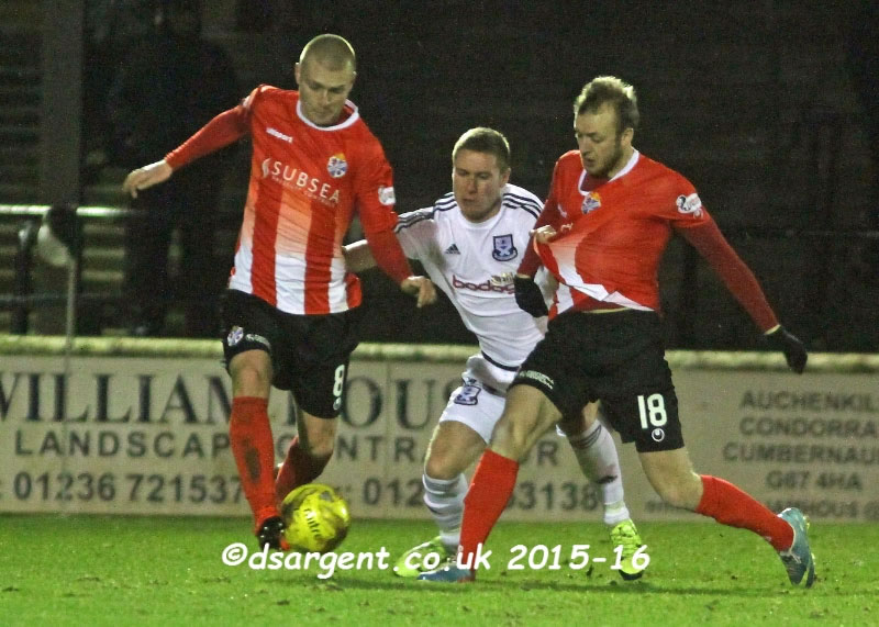 Sub Michael Wardrope battles two opponents in midfield