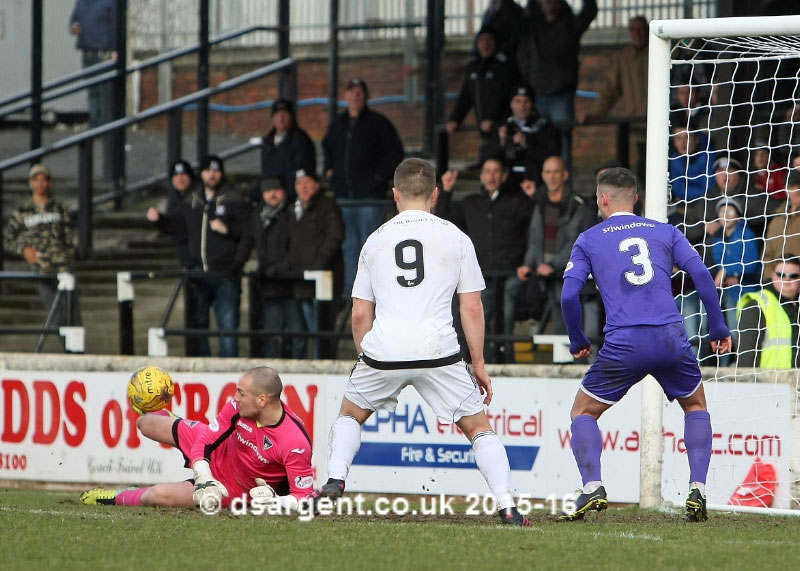 ...keeper Sean Murdoch blocks Jamie Adams' drive