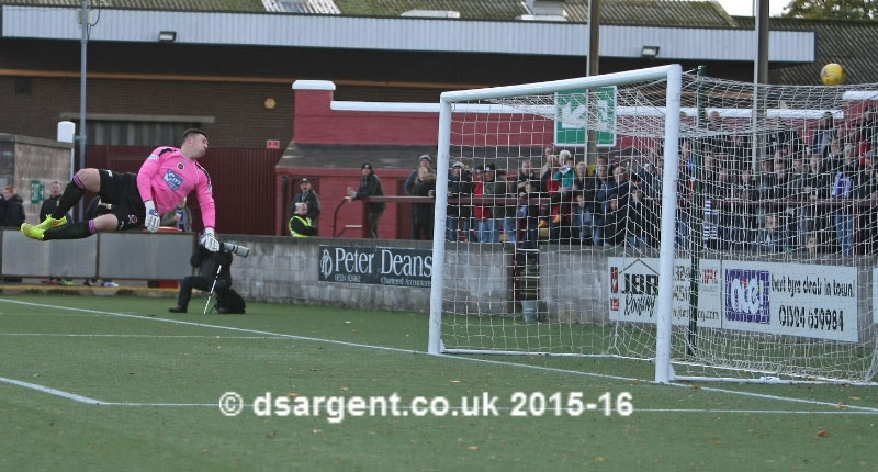 ...the keeper's fingertips divert Brian Gilmour's drive