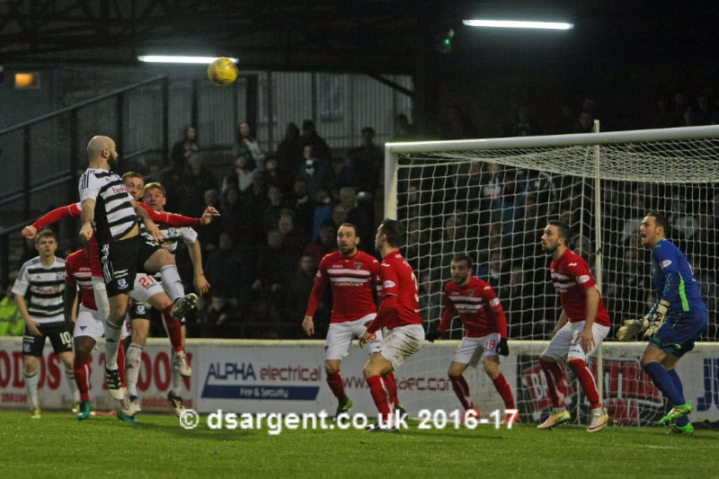 Gary Harkins sends a header narrowly over