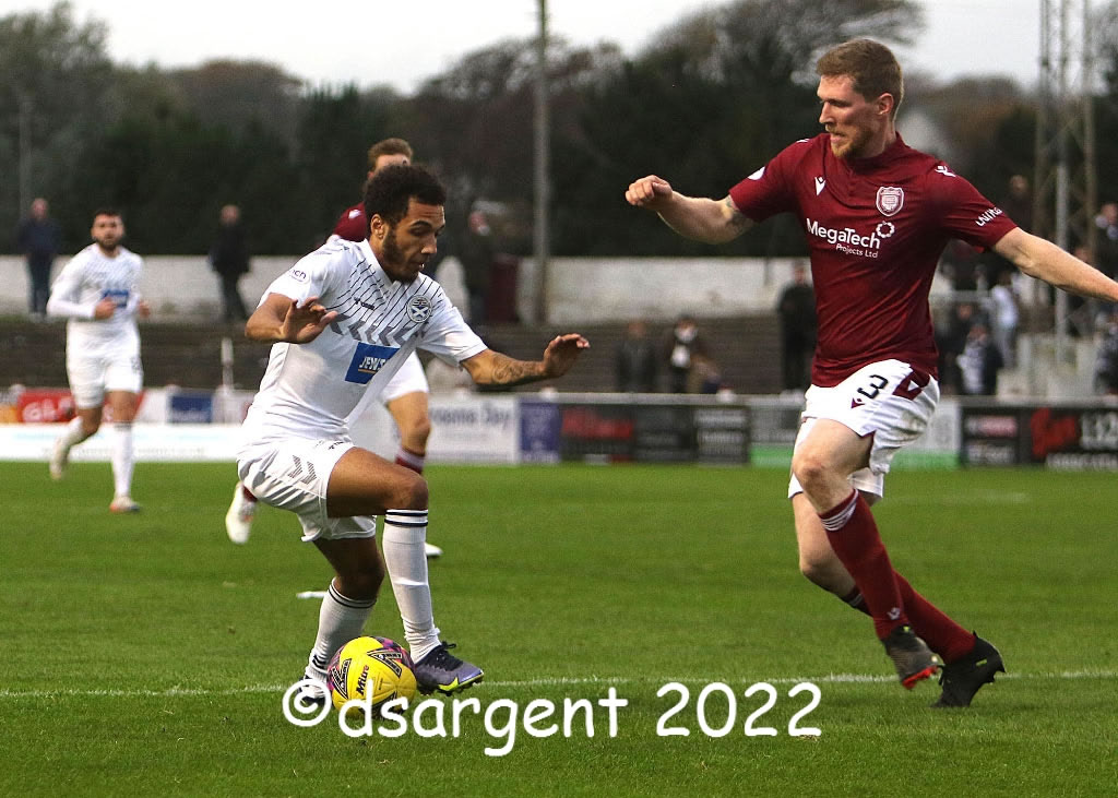 Arbroath's Colin Hamilton is about to crash into Jayden Mitchell-Lawson...