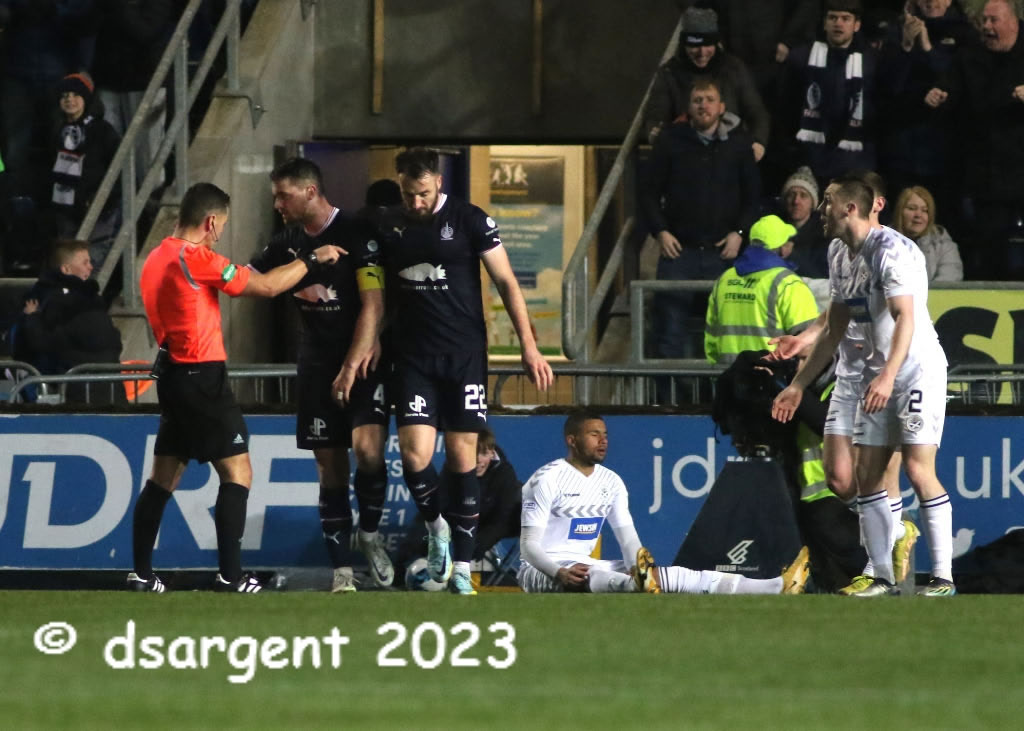 Referee Nick Walsh spots a hand ball in the Ayr penalty box...