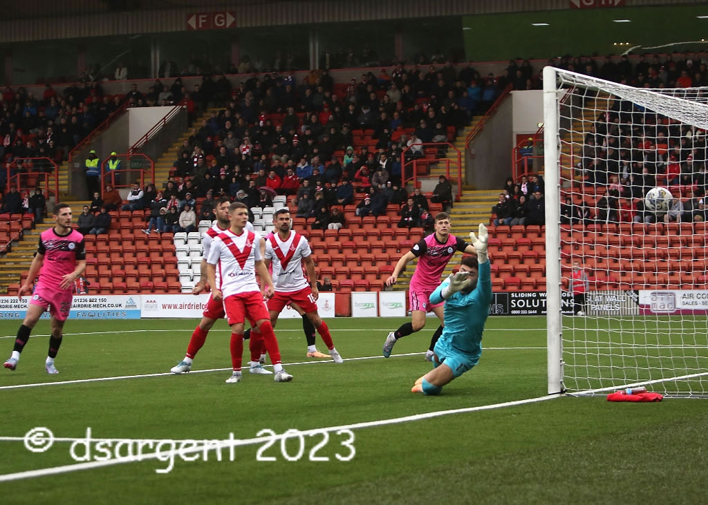 ... Anton Dowds' shot crashes into the net behind home keeper Joshua Rae ...