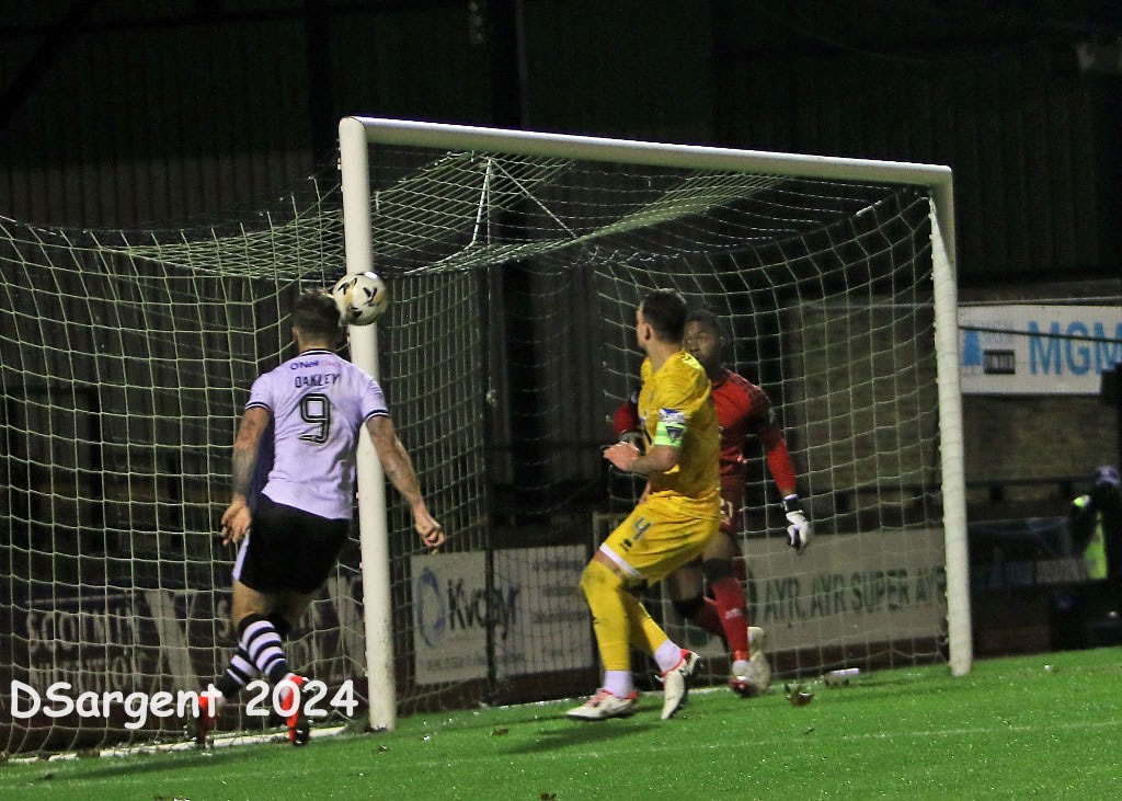 George Oakley is inches away from a far post cross.