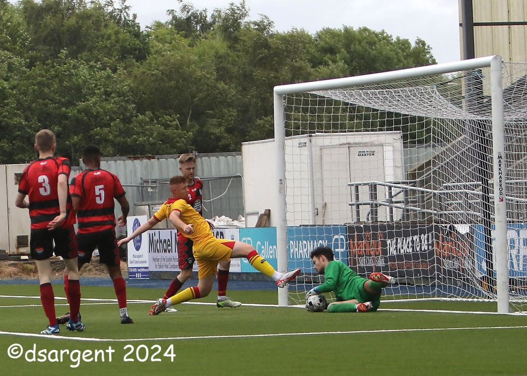 Fraser Bryden is narrowly beaten to a dangerous cross.