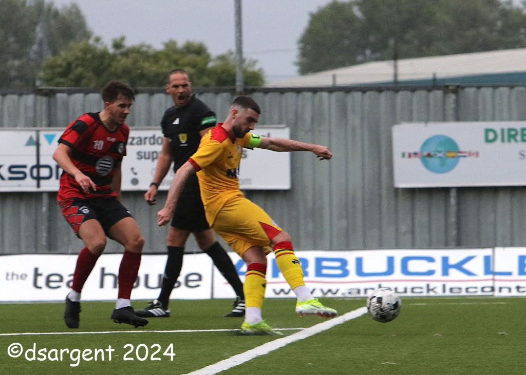 Ben Dempsey meets a clearance at the edge of the penalty area ...