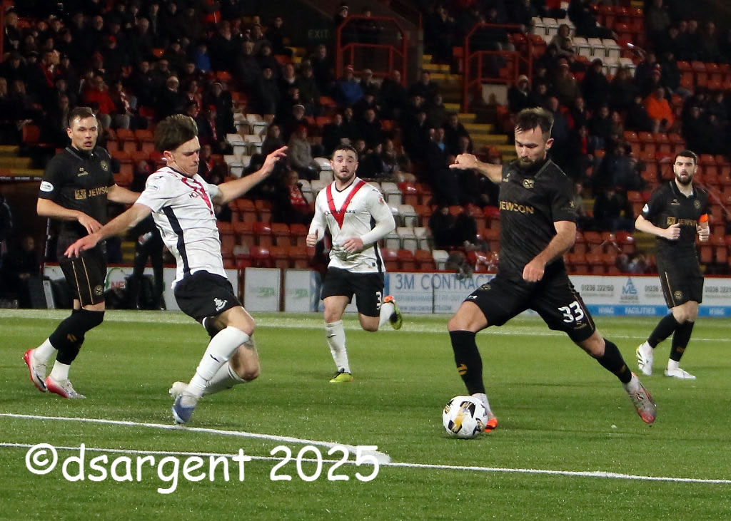 Scott McMann drives an effort from the edge of the penalty area.