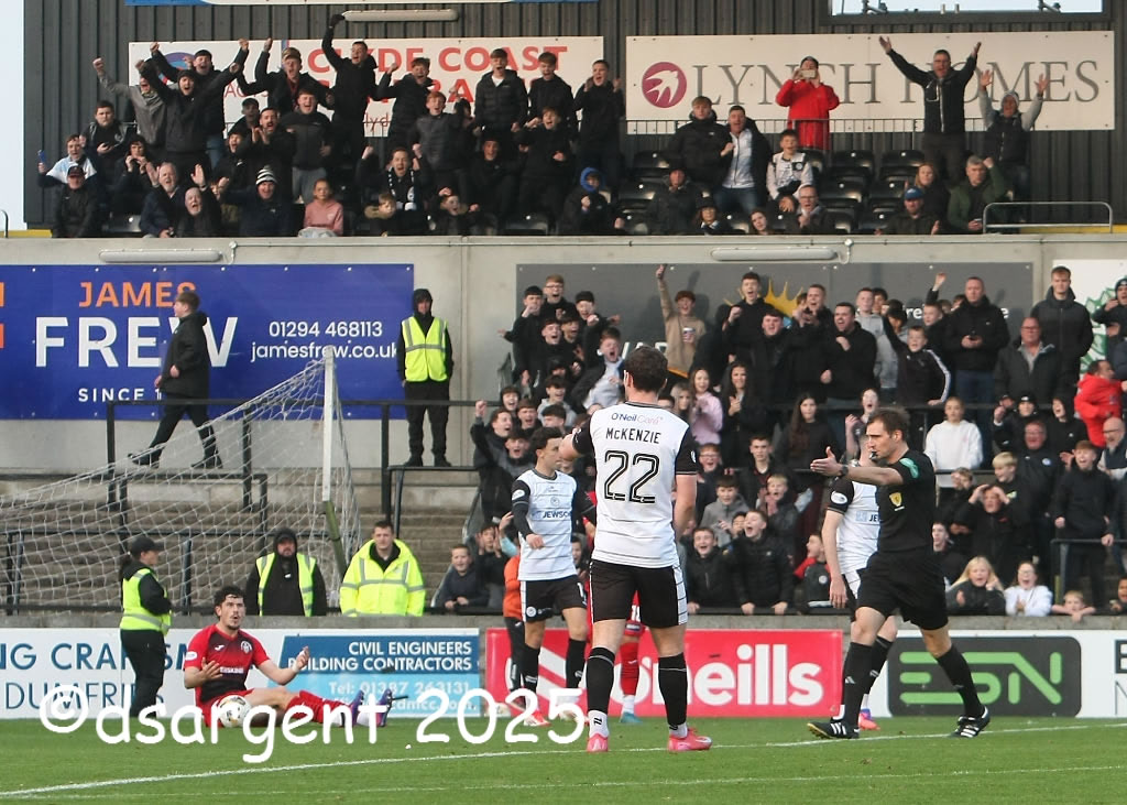 Referee Iain Snedden spots a hand-ball in the area. Penalty Ayr! ...