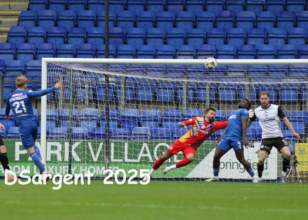 A combination of keeper David Mitchell and home attacker deflect an effort.