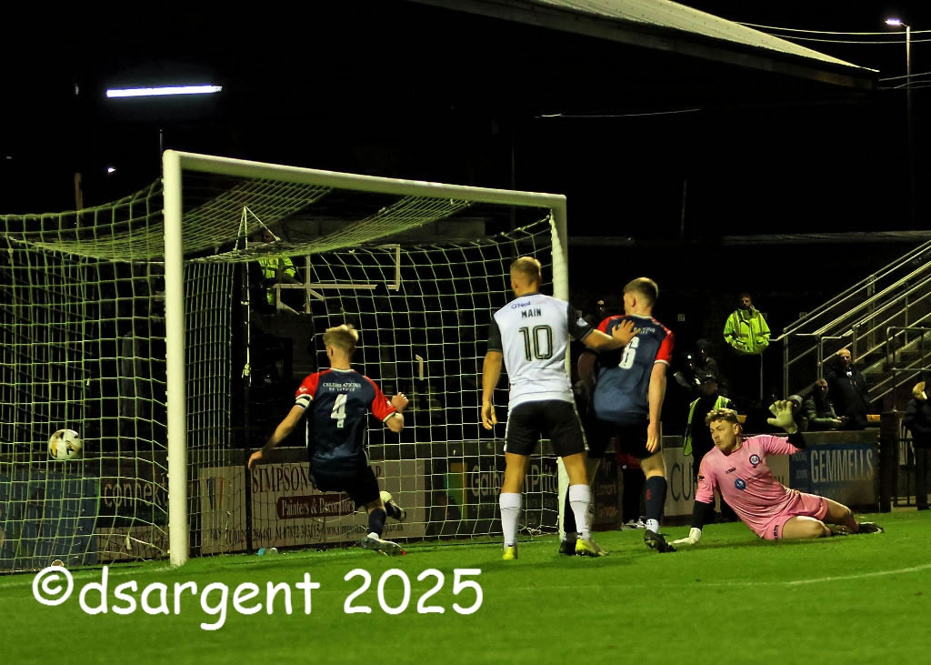 Turriff defenders are beaten by Dom Thomas' shot from the edge of the box ...